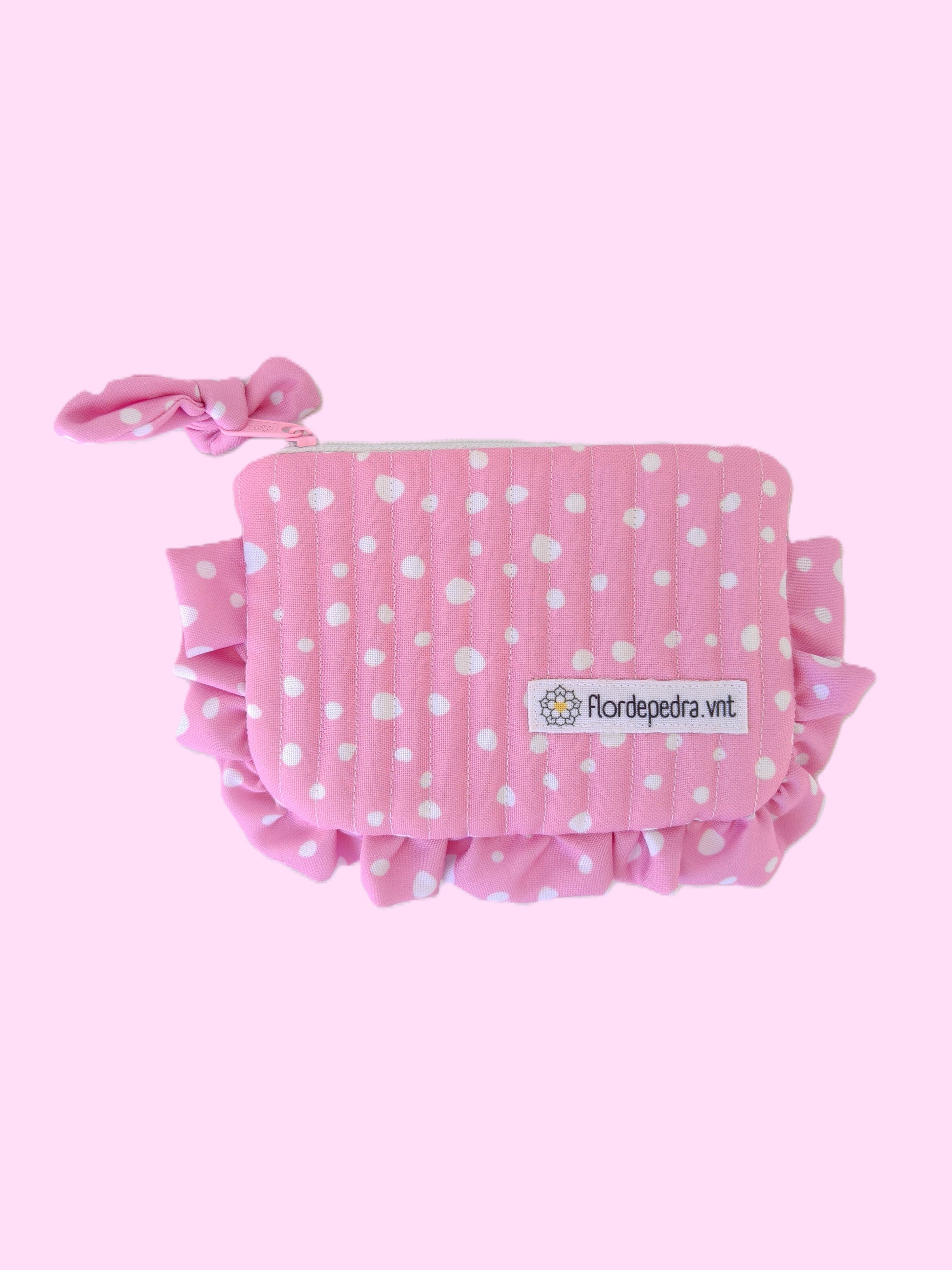 Bolsa prática e super querida, perfeita para guardar maquilhagem, pensos, tampões, moedas ou outros pequenos essenciais. Com folhos delicados e fecho resistente, é o acessório ideal para levar sempre contigo.