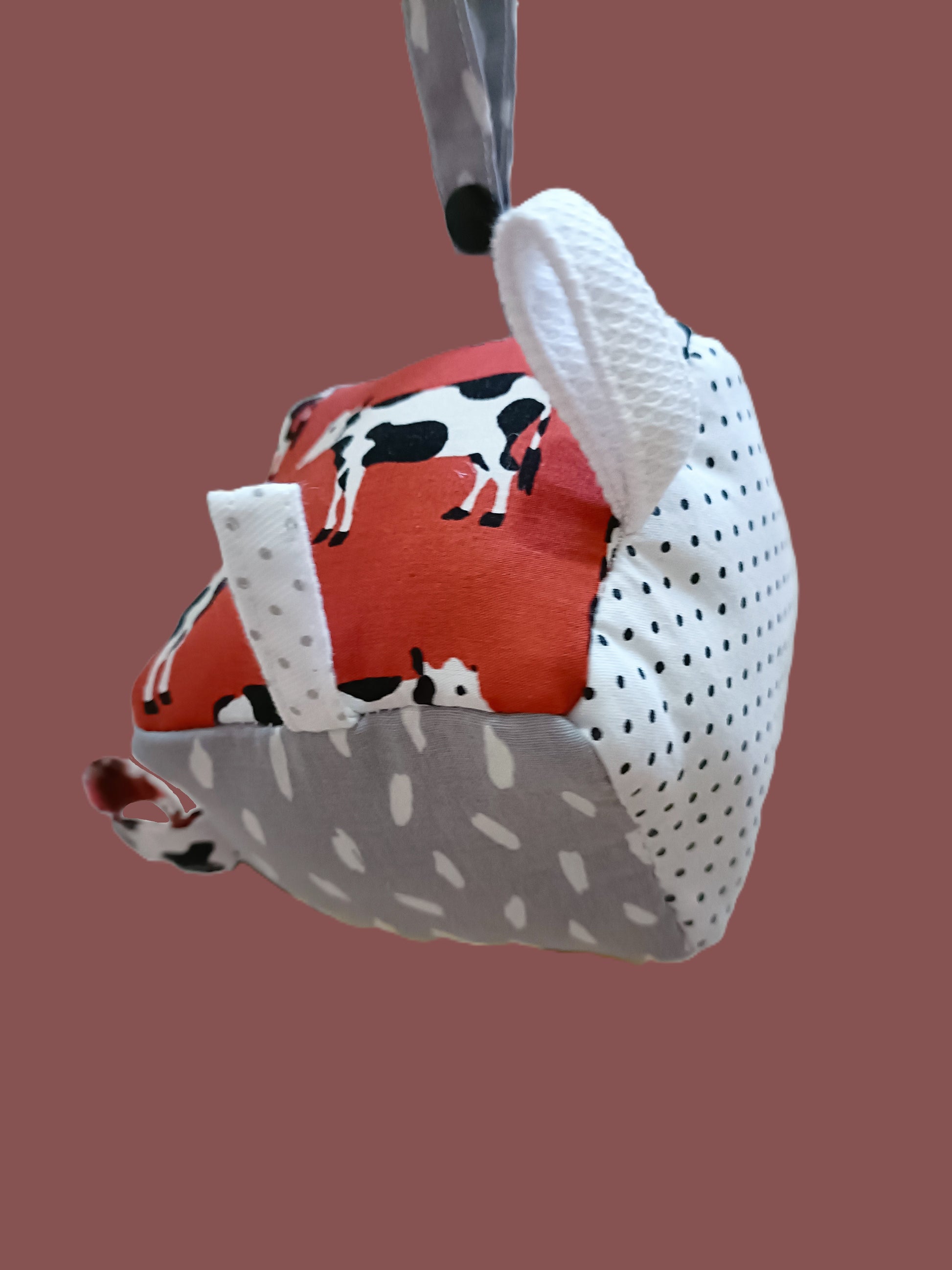 Feito à mão em tecido macio, combina cores alegres, diferentes texturas e fitas ou elementos para agarrar, ajudando o bebé a explorar o mundo através do toque e da visão.