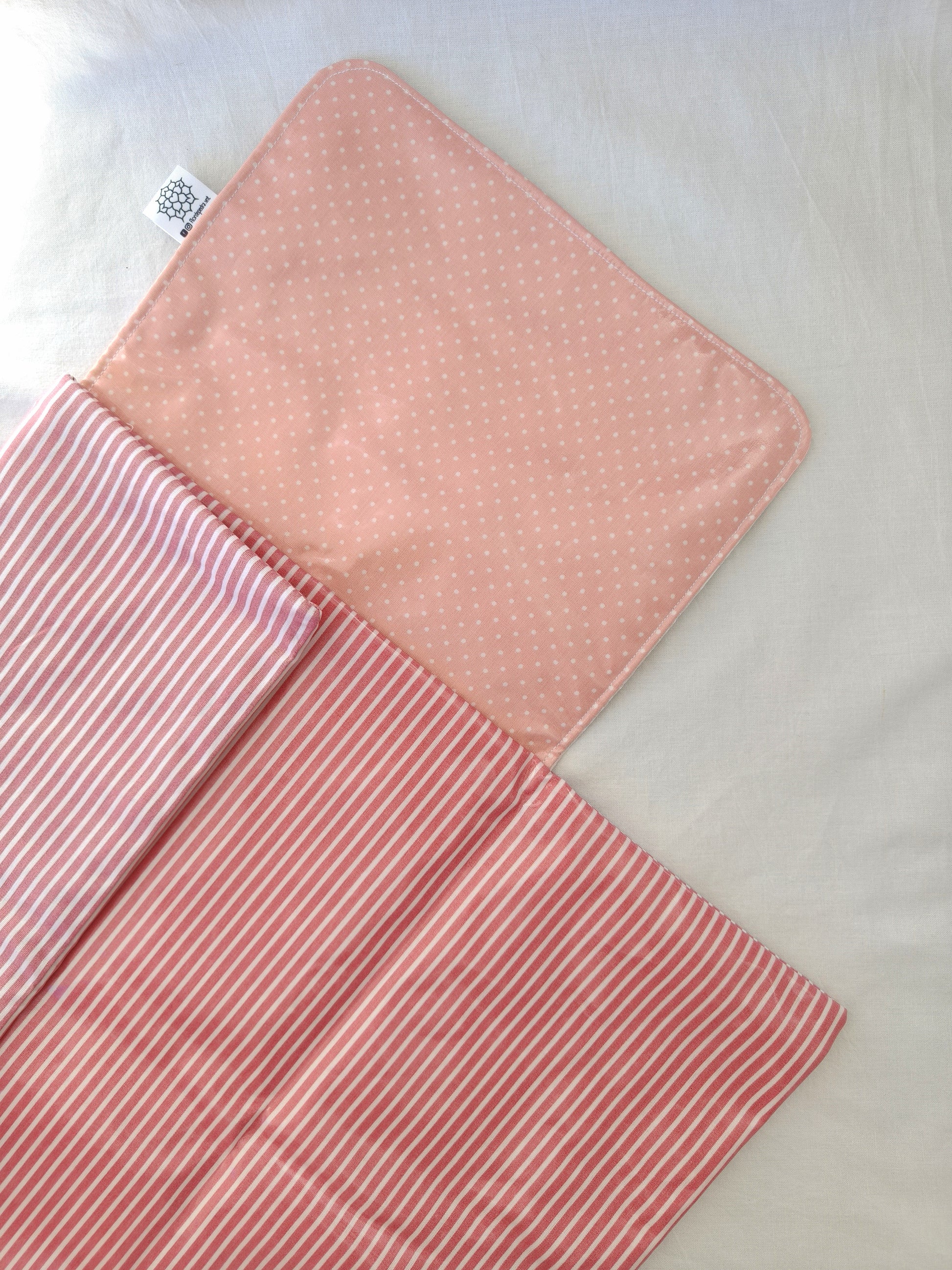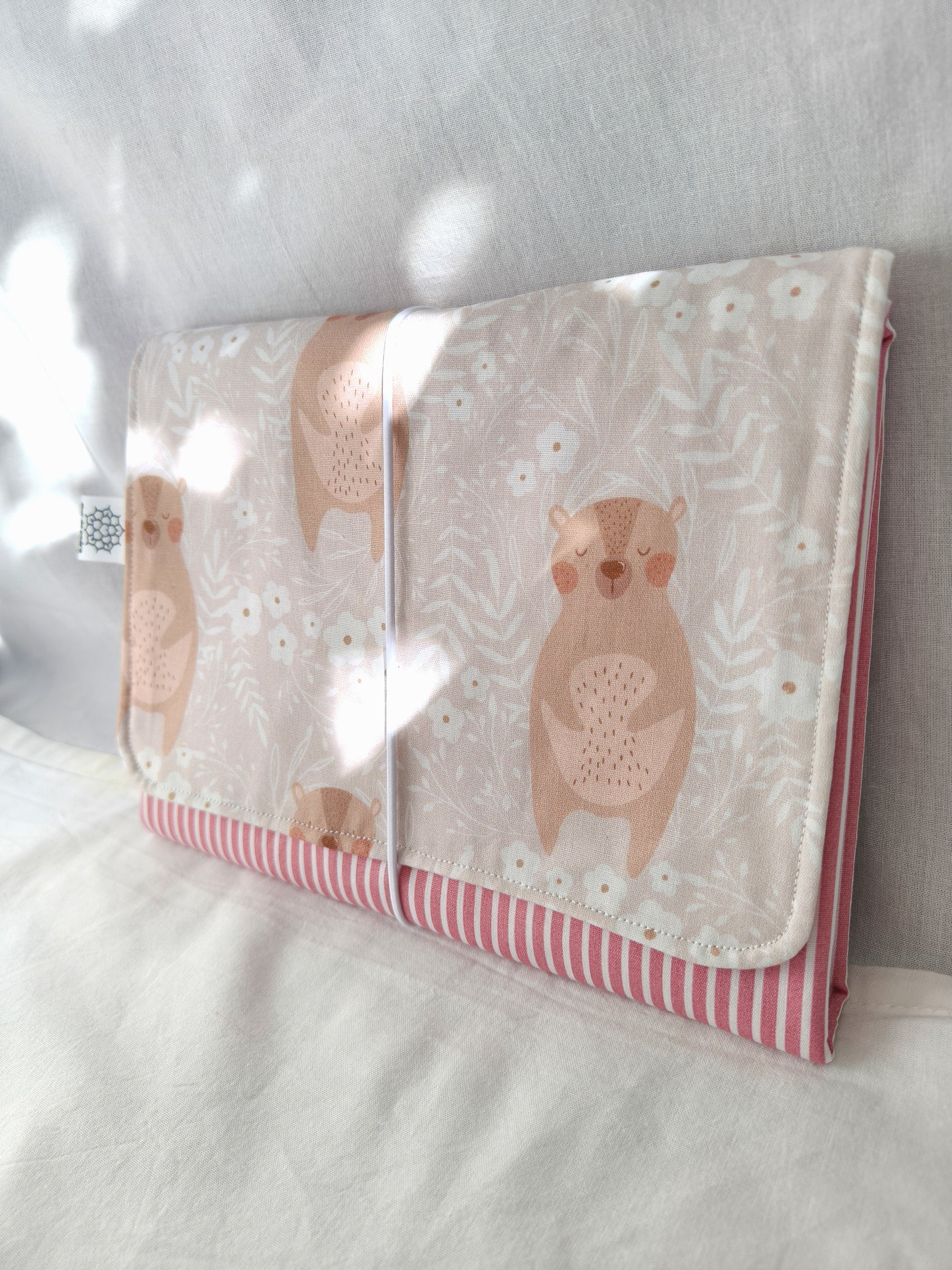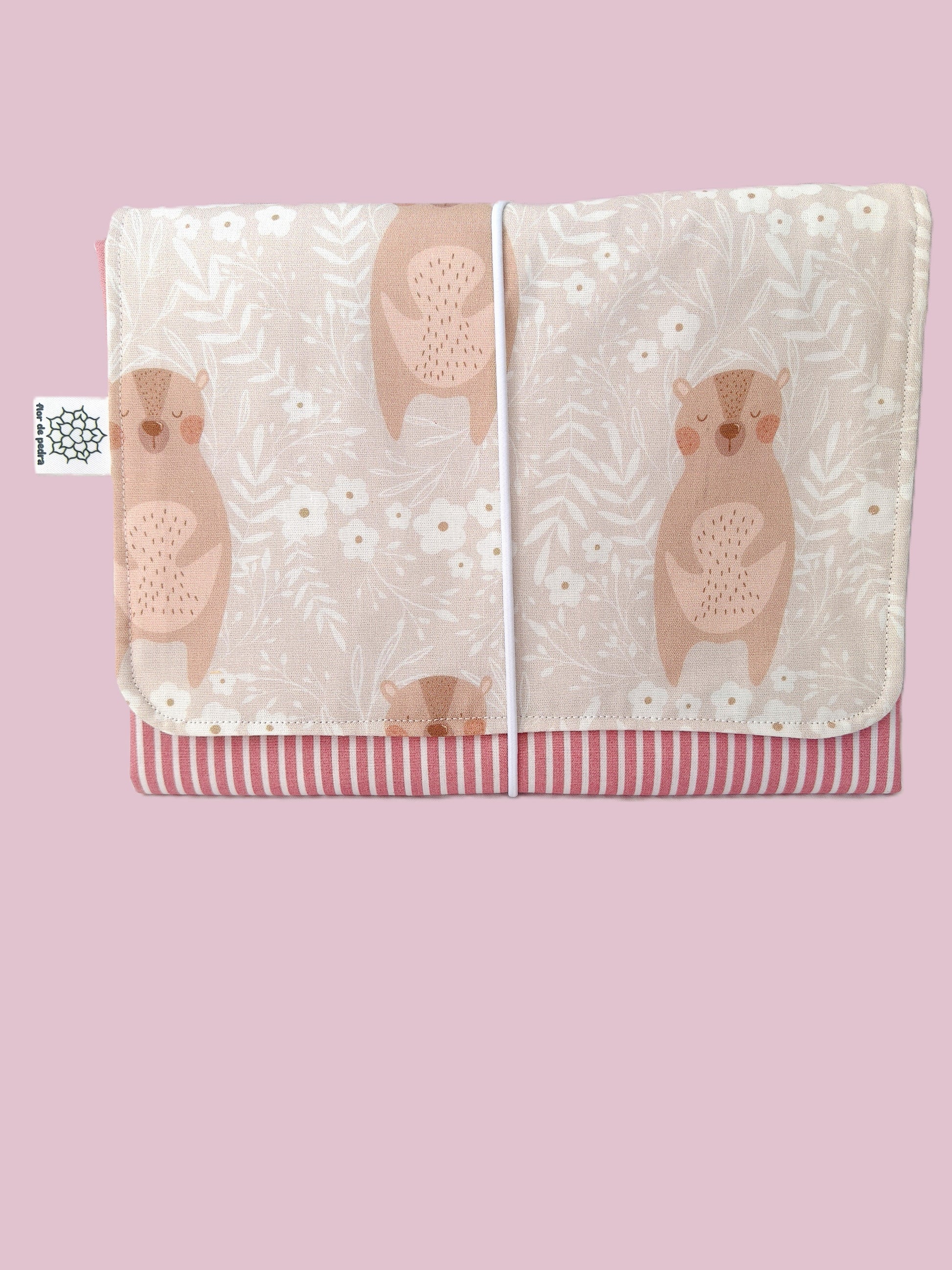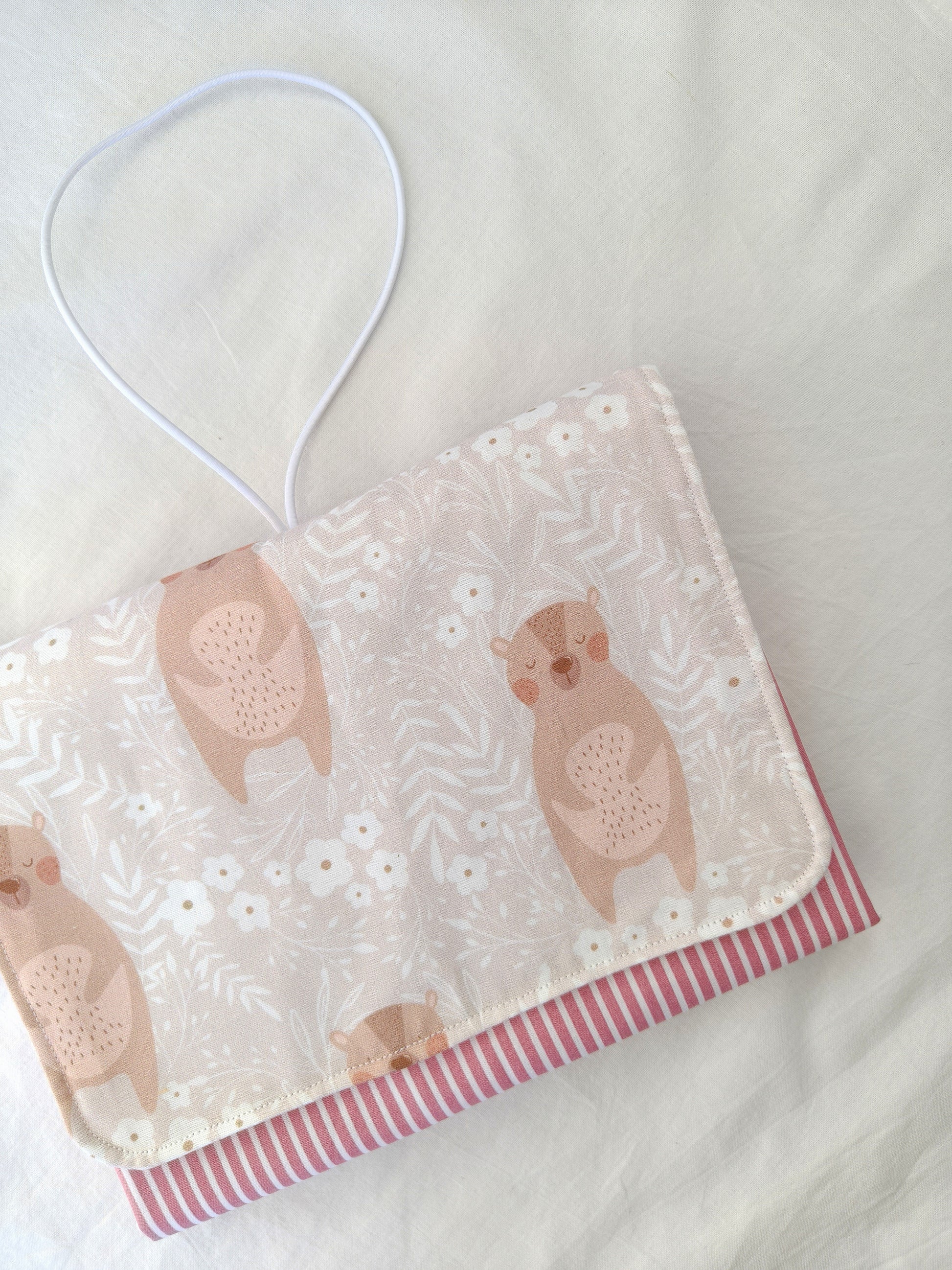 Fino e leve, o muda fraldas é perfeito para levar na mala sem ocupar espaço. O interior impermeável facilita a higienização após cada troca,