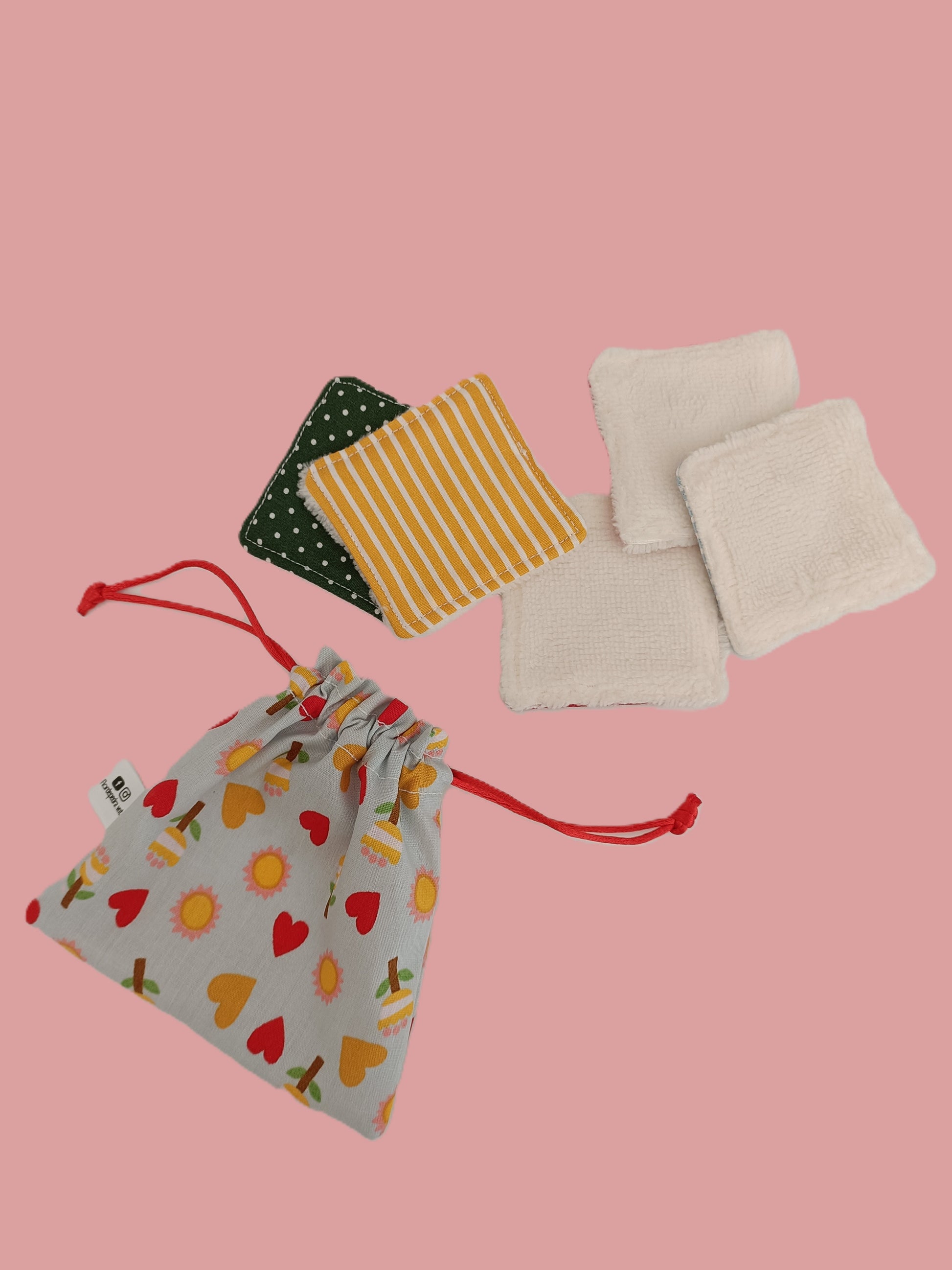 O conjunto inclui 5 toalhitas reutilizáveis, que vêm num saquinho de algodão, perfeito para as manter arrumadas ou para colocá-las diretamente na máquina de lavar, evitando que se percam entre a roupa.