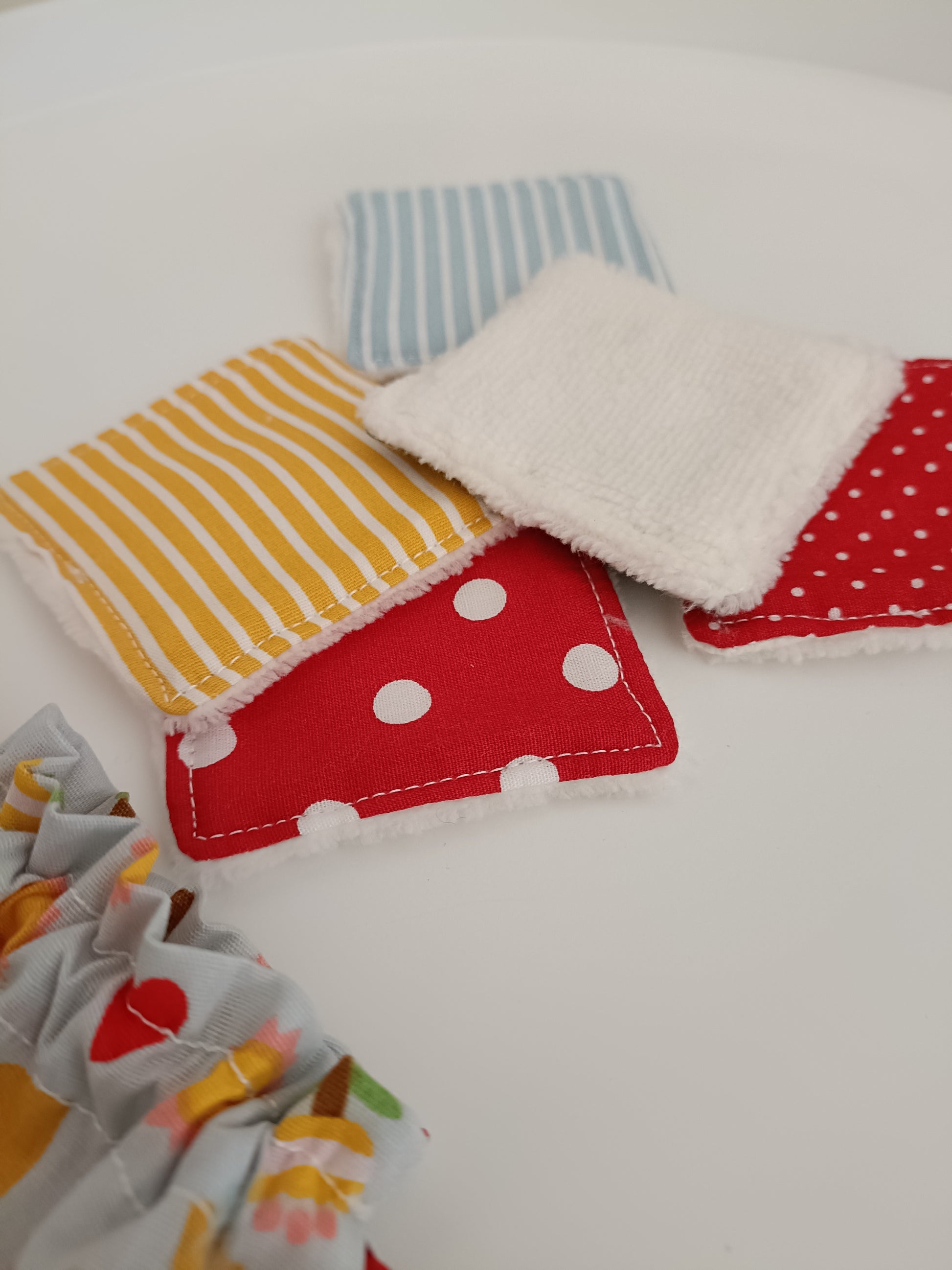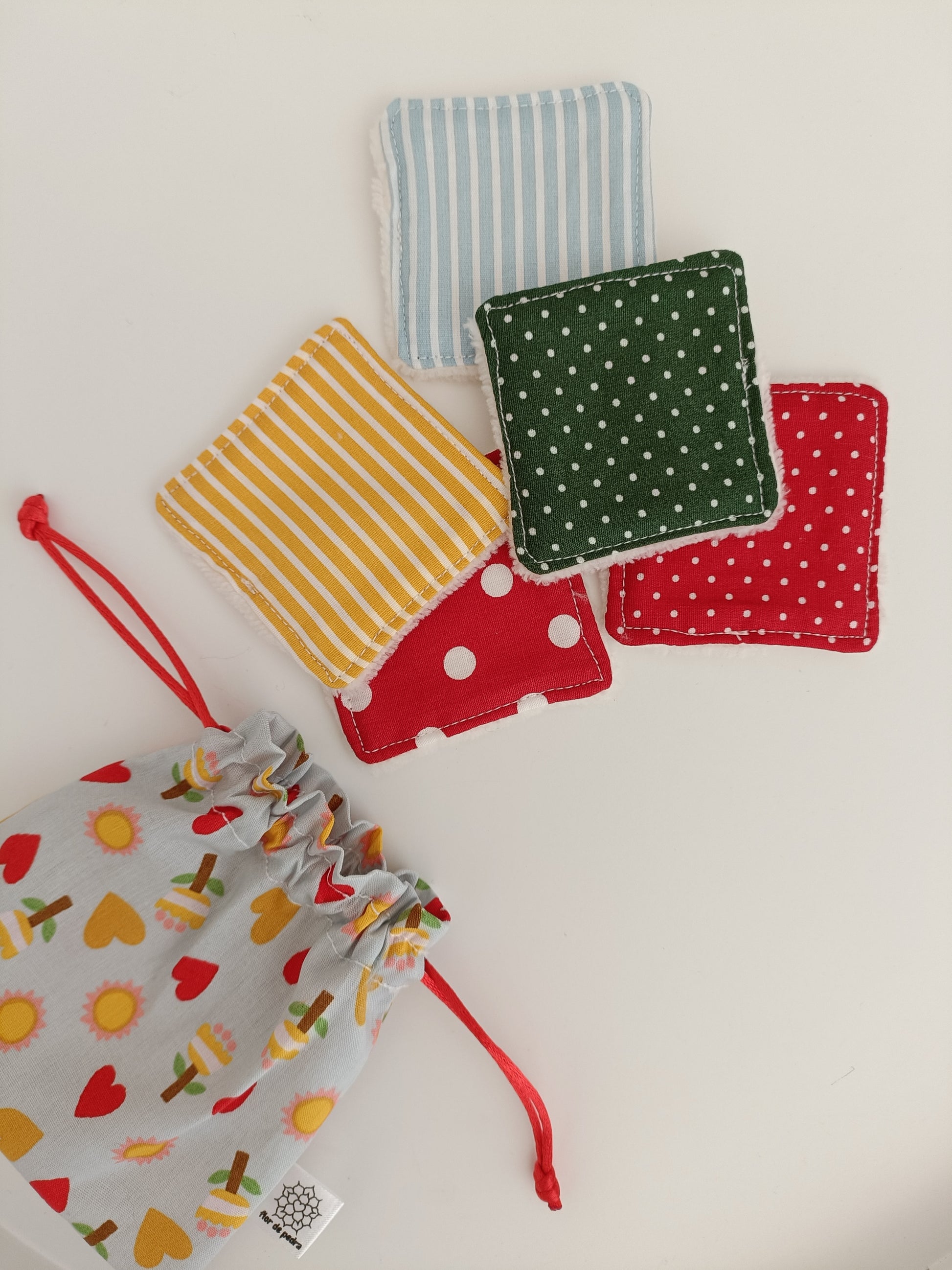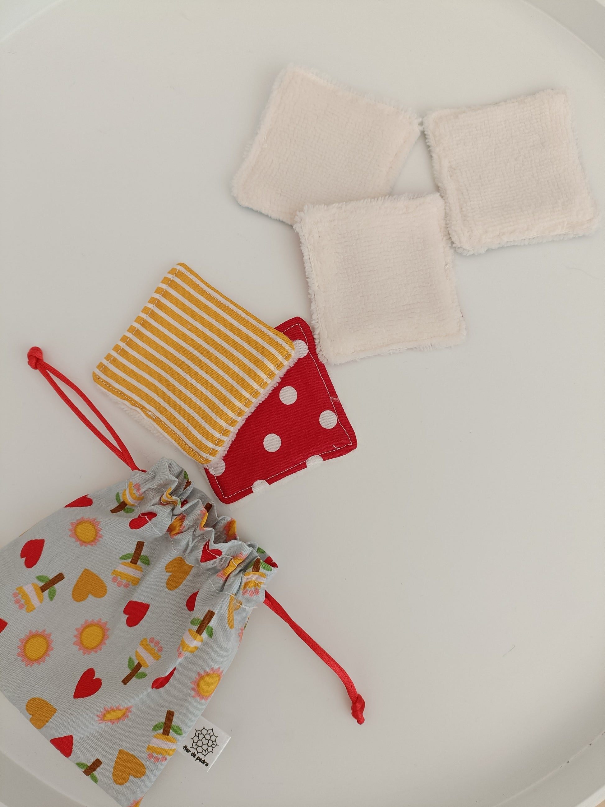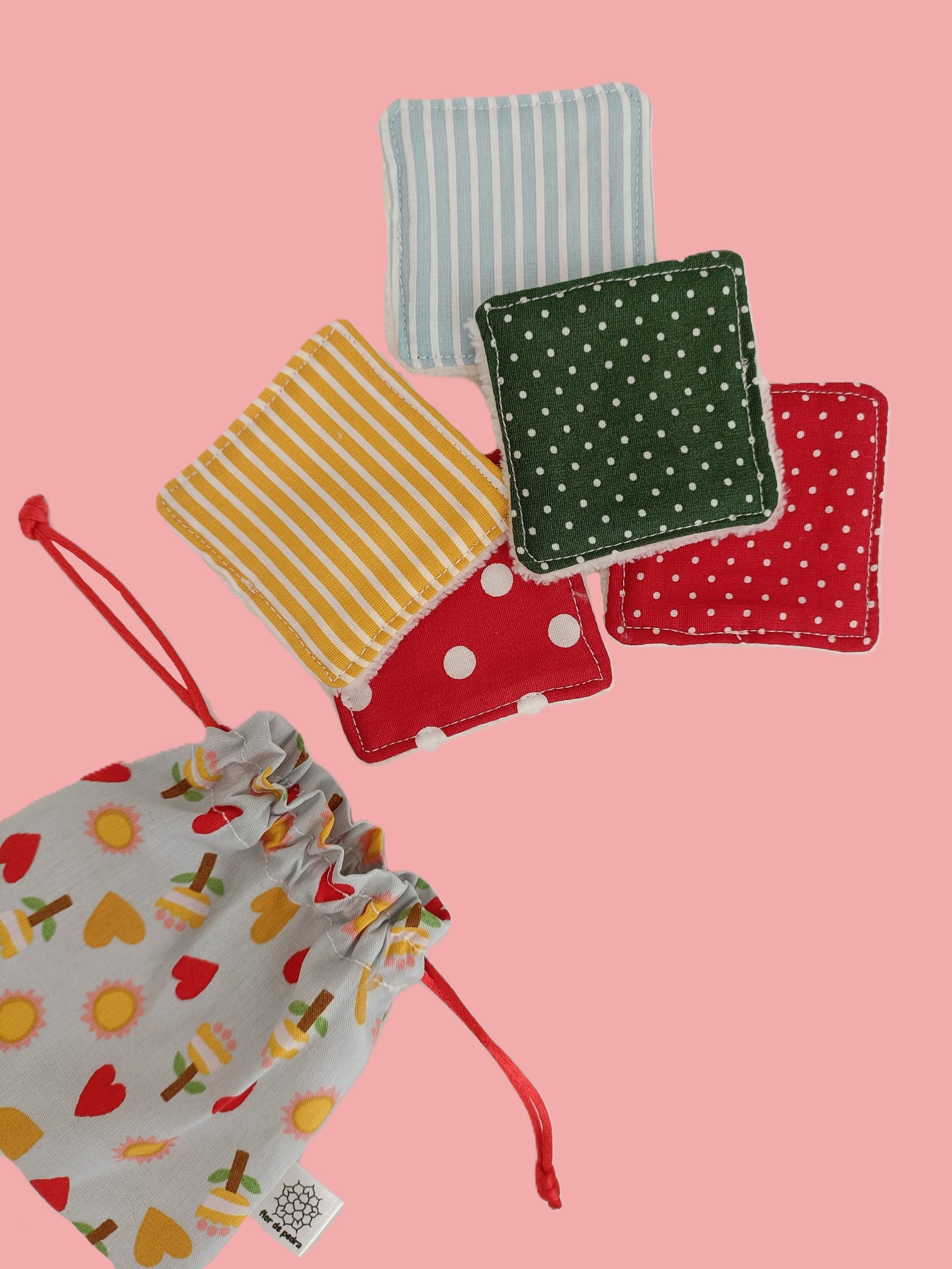 O conjunto inclui 5 toalhitas reutilizáveis, que vêm num saquinho de algodão, perfeito para as manter arrumadas ou para colocá-las diretamente na máquina de lavar, evitando que se percam entre a roupa.